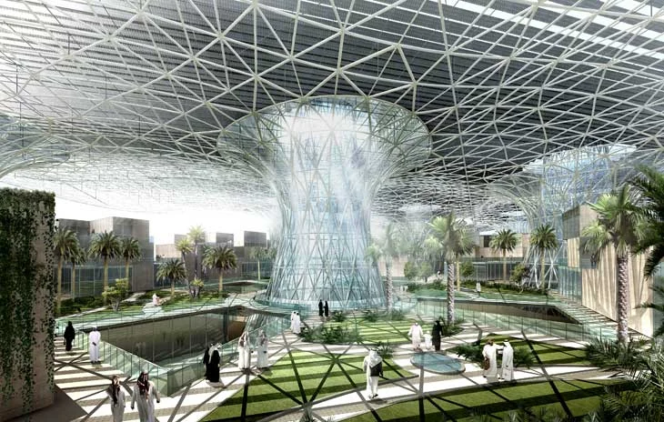 In addition to new technology, the design draws on traditional Arab and Islamic spatial principles to create a natural cooling effect and require less air conditioning. Narrow streets with cantilevered facades are to help maximize shading and reduce glare in order to provide cooler ambient temperatures. These architectural details combined with strategic green space and a renewable-energy-powered public transportation system are intended to minimize energy demand and pollution.