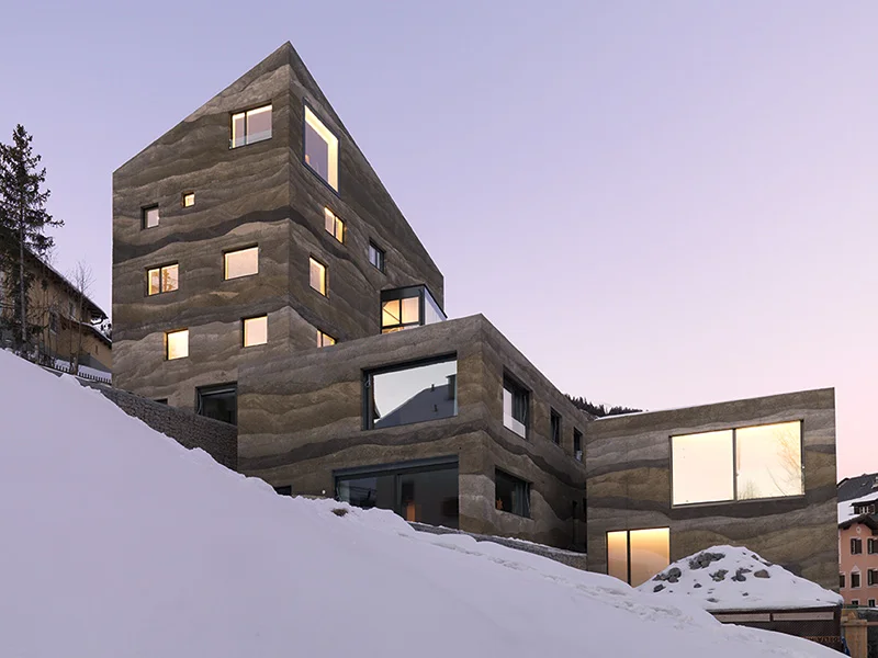 Lazzarini Architekten - Colored bands of soil at the rammed-earth residential development in Sameden, 2007. The small cluster of apartments are staggered along the steep sloping site, separated by small passageways that reference the thin alleyways of the nearby historic center. The waving layers of rammed-earth imply a geological history; giving the building the appearance of an archeological relic dug from the earth, rather then a new building placed on it. (Image via. Thanks to BFC for bringing it to my attention).
