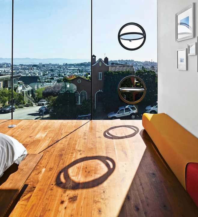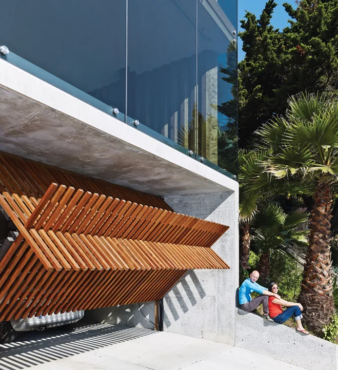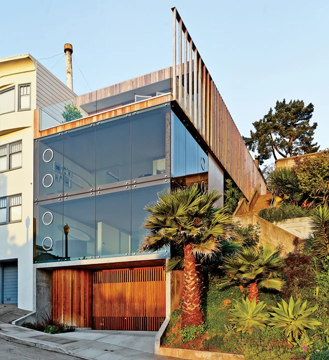 The distinctive façade has operable porthole windows and a slatted garage door custom-built by Raimundo Ferreira.