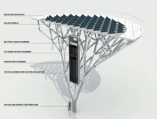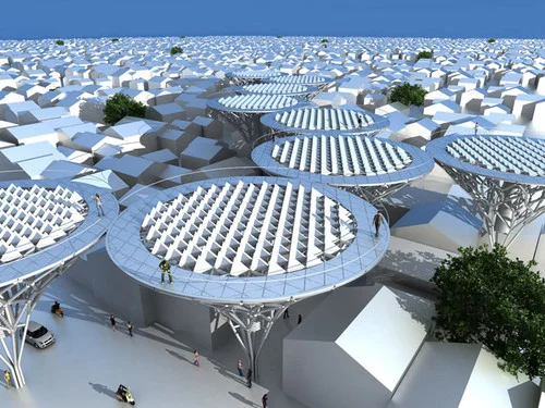 It’s bad enough that the kampongs in Jakarta, Indonesia, lack basic amenities like water, electricity, and parks. It’s especially bad that these dense urban settlements have nowhere to build new infrastructure, short of razing homes. The Los Angeles firm GABPA conceived of low-tech infrastructure stations that pack rainwater storage tanks into 50-foot-tall treelike towers. At ground level, the stations feed filtered water into faucets. Aboveground, “treetop” platforms—each about the diameter of a parachute—act like sunshades and can also serve as rainwater collectors, paved playgrounds, or green roofs. Hovering over alleys, streets, courtyards, and public squares, the platforms form what GABPA calls a Canop’City—a city above the city. The symbolism isn’t lost on Alejo Paillard, the 36-year-old GABPA cofounder. “These objects should be signifiers of urban renewal,” he says, “a branding device helping to reestablish the importance of underprivileged urban areas.”