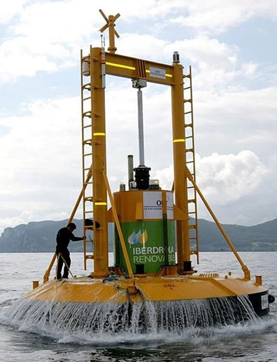 The 150-foot tall buoys are mostly submerged. The buoy moves up and down and the wave motion moves a long piston up and down, which in turn, drives a generator. They can generate power in waves ranging from 5 feet to 23 feet high. All ten buoys can share one underground cable back to dry land, and the whole array can be placed in a 30-acre space.