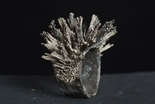 Paris-based designer Laurent Milon makes rings decorated with iron filings shaped by magnetism, then galvanized with silver and nickel.