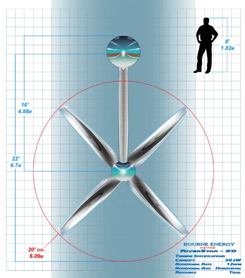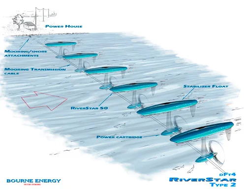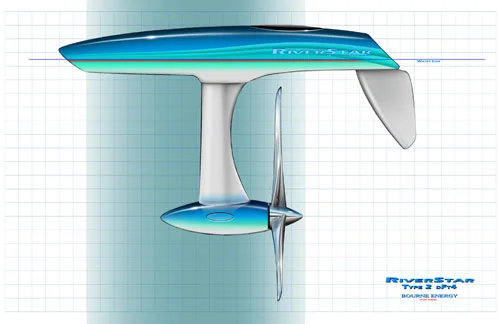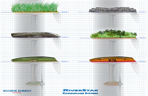 The BackPack Power Plant - Type 1 (BPP-1) is a man-portable renewable energy generator only 3 feet in length and weighing less than 30 pounds. Each unit is self-contained with its own integrated power, control, cooling and sensor systems. The unit collapses into a backpack size module with the generator, hub and folded blades stored inside. The unit produces approximately 500 W/unit high quality continuous power depending on river current. The BackPack Power Plant can be set up singularly or in arrays of over 30 kW.”