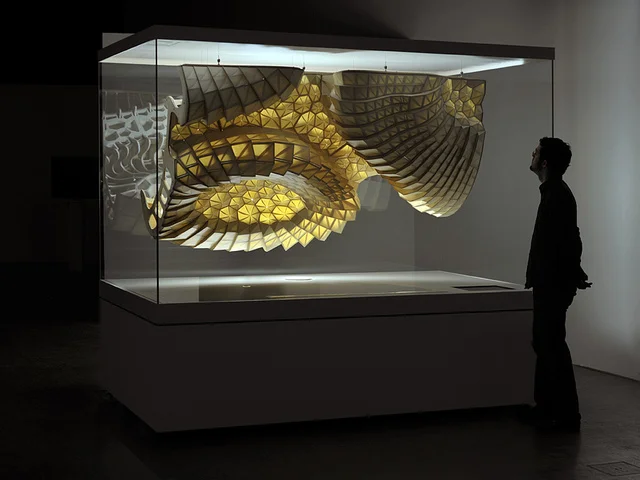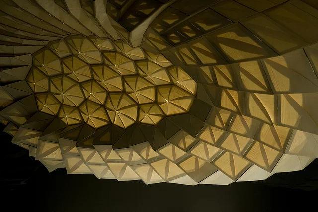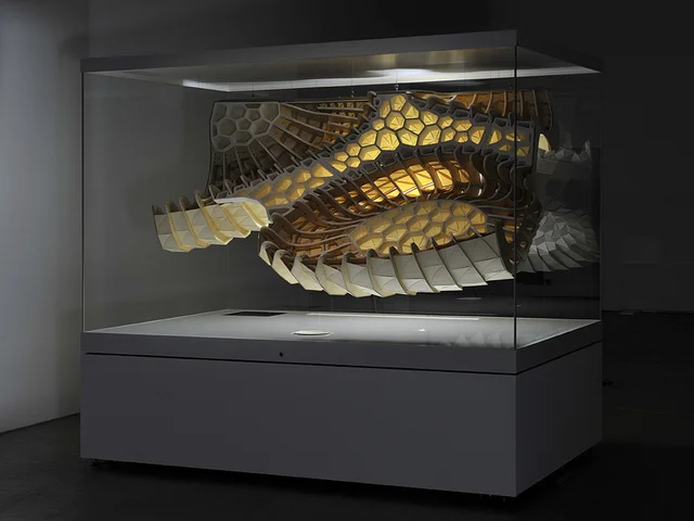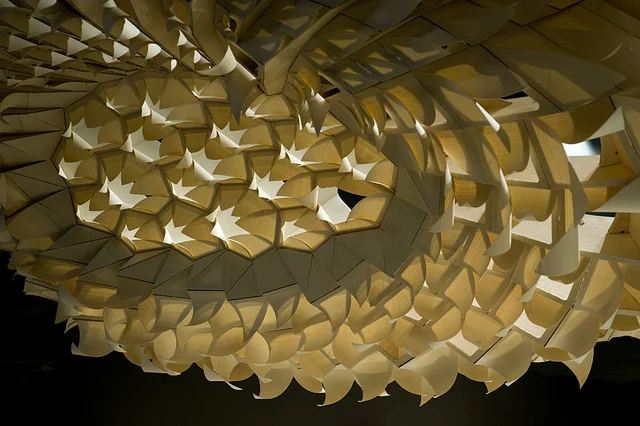 Achim Menges in collaboration with Steffen Reichert produced the installation entitledHygroScope – Meteorosensitive Morphology at the Centre Pompidou, Paris in 2012. They have created models out of wood that are purposefully designed to interact with moisture found in the air. After years of research they have developed the system calledHygroScope. This climate-responsive composite material is comprised of maple veneer and synthetic composites. It responds to humidity in a such a way that the material appears to be “breathing”. The models are displayed in glass cases that can be programed to control the amount of humidity in the air, the composite materials then respond to these environments creating completely unique visual experiences. Please view the video below!