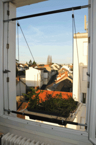 The window-mounted chassis, which holds three planters, is operated via pulley, as a sort of drawbridge outfitted with houseplants and herbs: