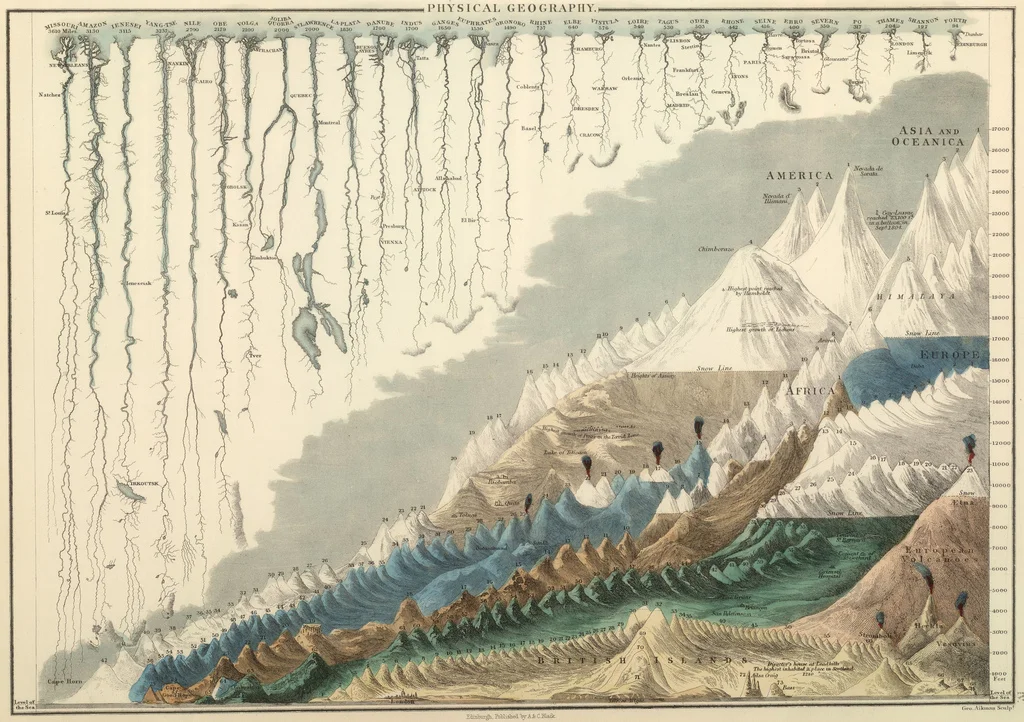 Tinted drawing showing the comparative lengths of rivers and heights of mountains worldwide.