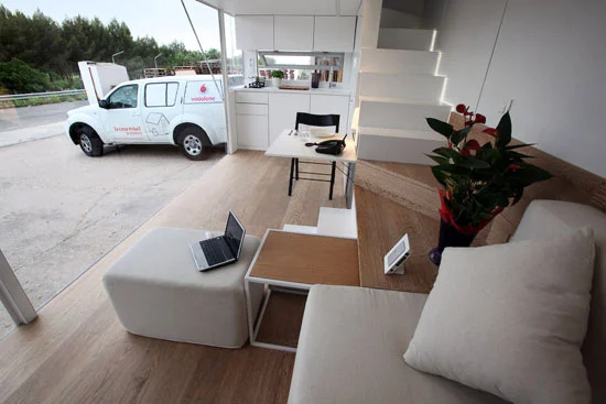 “La casa movil de Vodafone,” or the Vodafone Mobile Home, creatively combines glass house living, tiny house design, loft-like features, sustainable elements, and portable architecture all in one tight package. Design Boomrecently reported that the portable home was designed by Waskman Design Studio, with CuldeSac, for Vodafone to showcase its fixed phone and wireless internet services. And blogger Marcos Morales and his family of four are vacationing throughout Spain with it as we speak.