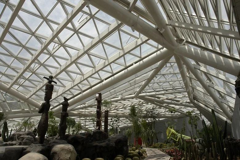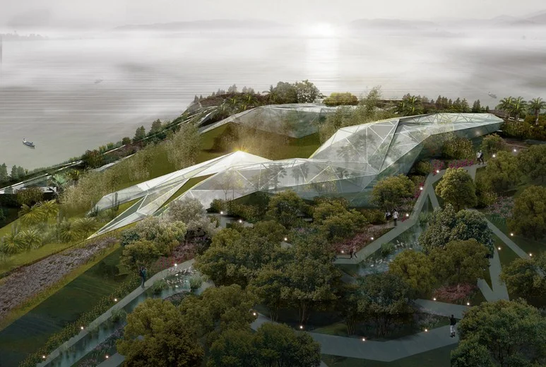 Conceived as a precious crystal, semi-submerged in splendid isolation, reached by boat across the lake followed by a short walk from the shore, the greenhouse blends into the hillside. Visitors access the building through a prolonged cut, literally scooped up from the ground, emerging into a light-filled reception space. From here the visitor passes along a tessellated mesh of paths to three different climatic zones with corresponding plant environments.The greenhouse has a horseshoe plan, creating a loop that changes radically in section to accommodate a series of unique planting and spatial conditions. With the interior and exterior ground planes gradually shifting in relation to each other, the visitor experiences a sequence of visual enclosures alternating with long vistas out and across. The horseshoe shape also generates an interior open-air courtyard, making it the natural centre of the building and creating a three-dimensional web of interior and exterior circulation.