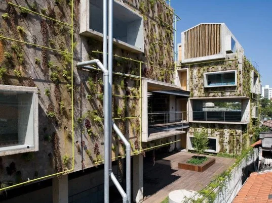 The unique office building is set amidst a creative neighborhood on the west side of São Paulo. Two volumes make up the building, which is clad in a porous concrete skin with pockets for plants. A complex water recycling network collects rainwater and grey water for use in irrigation and toilets, while a green roof helps minimize storm water runoff.