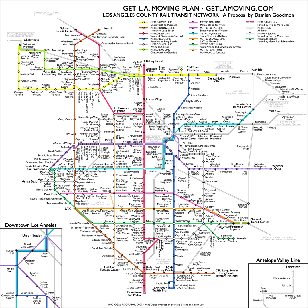 At any given moment, some concerned group of citizens will be agitating to improve the situation. Right now such a group is Get L.A. Moving. They’ve put together an amazing proposal for a serious subway network that would utterly transform the city, while respecting the natural contours of the existing urban environment.