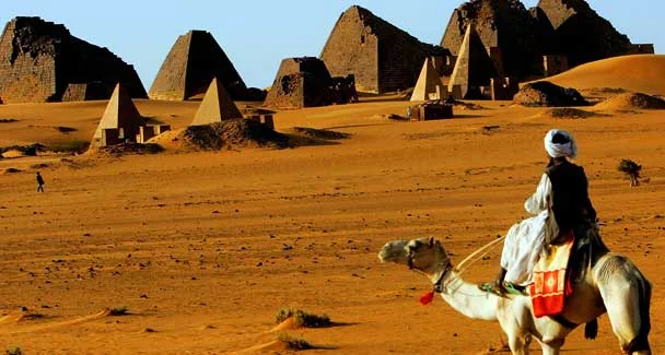 - A Sudanese man sits on a camel as he looks at the pyramids in the Meroe desert, north of Khartoum. There is not a tourist in sight as the sun sets over sand-swept pyramids at Meroe, but archaeologists say the Nubian Desert of northern Sudan holds mysteries to rival ancient Egypt.