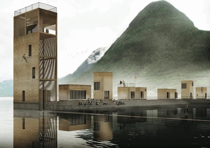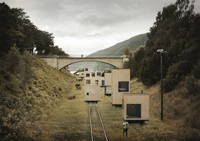 A project for the Norwegian city of Åndalsnes that was awarded third prize in an open international masterplan competition. Mobile buildings roll on old train tracks as season and situations change, complementing the city and landscape with facilities like a rolling hotel, a rolling public bath, a rolling park and a rolling concert hall. Really dreamlike. See all the details here.