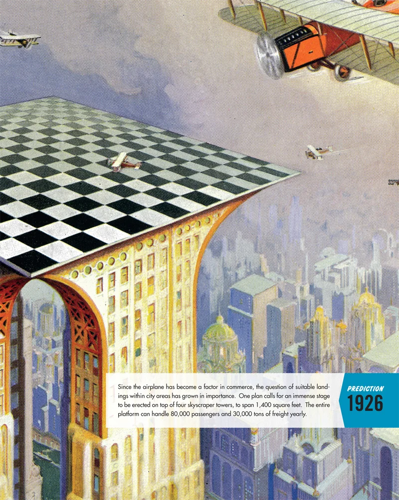 Posted this which reads: “Since the airplace has become a factor in commerce, the question of suitable landing within city areas has grown in importance. One plan calls for an immense stage to be erected on top of four skyscraper towers, to span 1,400 square feet. The entire platform can handle 80,000 passangers and 30,000 tons of freight yearly.”