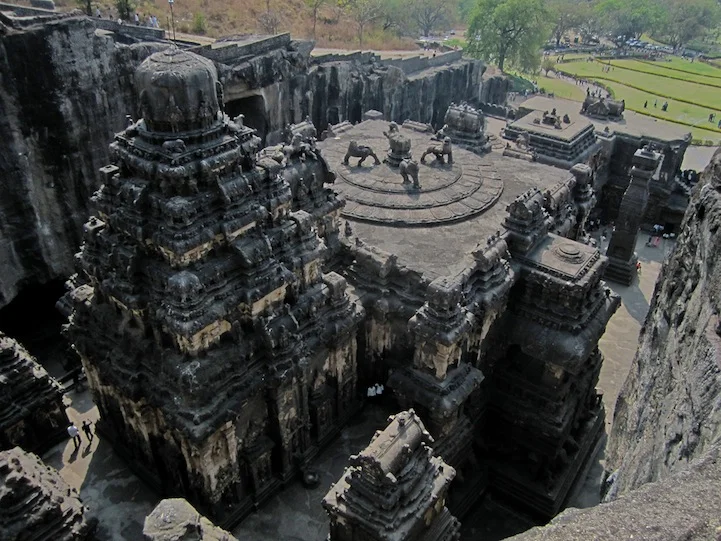 The Kailash Temple is notable for its vertical excavation—carvers started at the top of the original rock, and excavated downward.