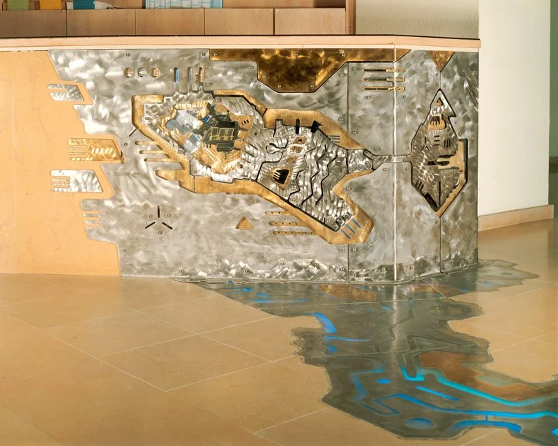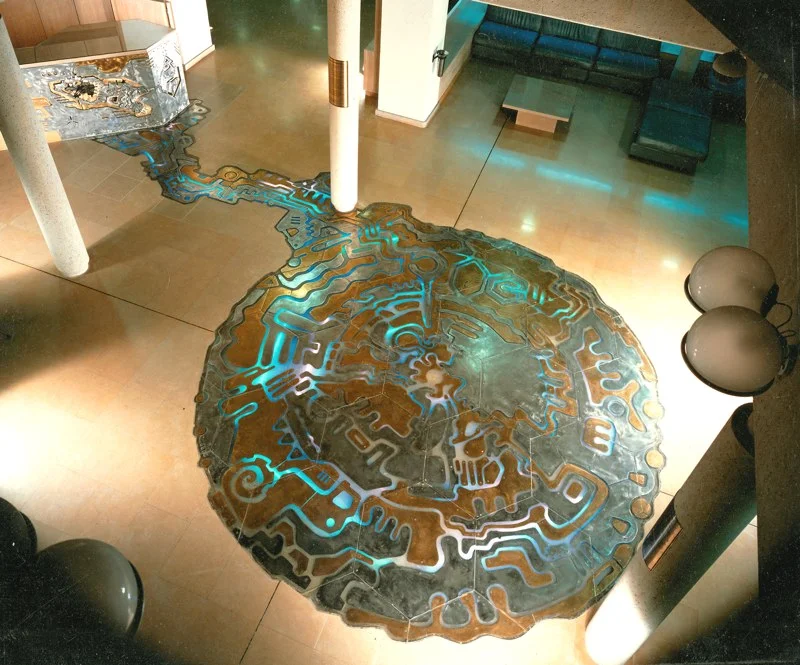 Cosmic Song is a work of art and cosmic ray detector embedded in the floor of one of the building entrances at CERN. It lights up with the constant rain of cosmic ray particles from outer space as people stand on the sculpture. The piece is made by the French artist Serge Moro.