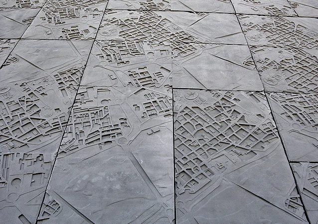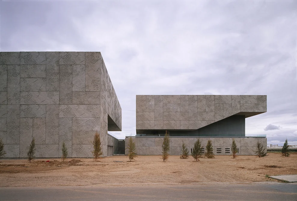 Nieto Sobejano - Merida auditorium and conference center, Merida 2004. The concrete facade is imprinted with maps of ancient walled cities. Via.