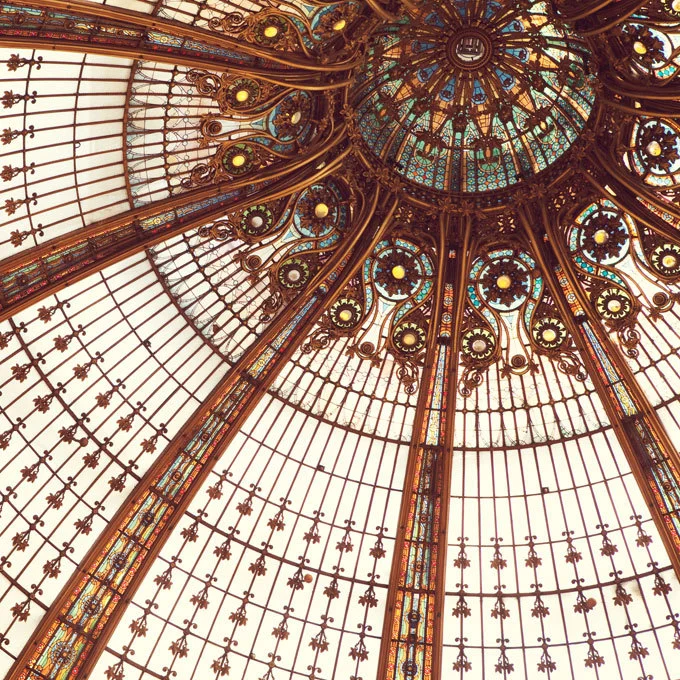 The stunning Art Nouveau domed ceiling of the Galeries Lafayette department store in Paris.
