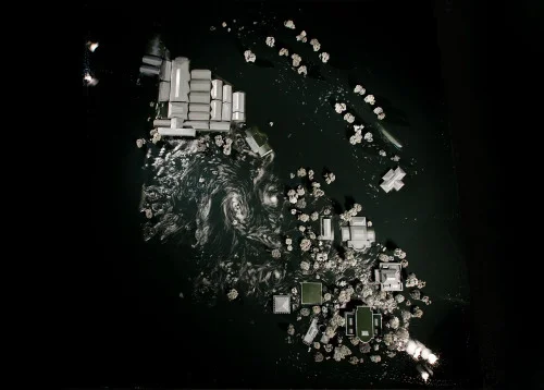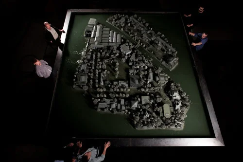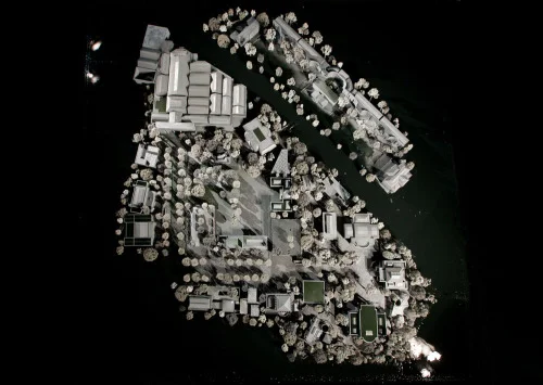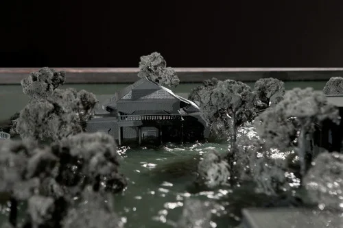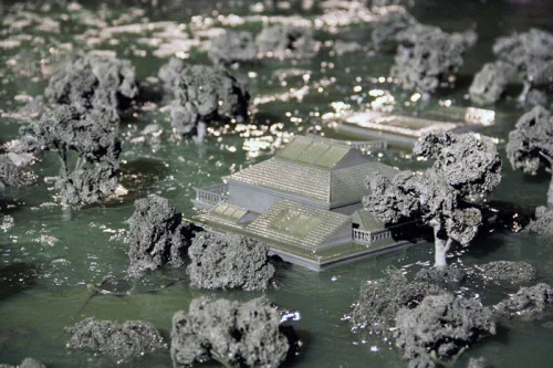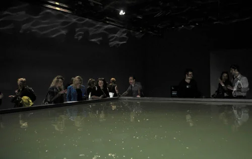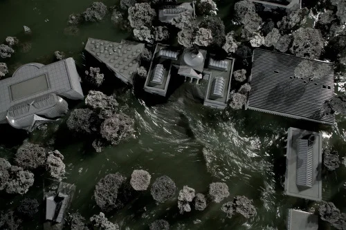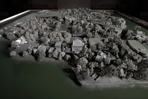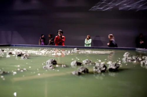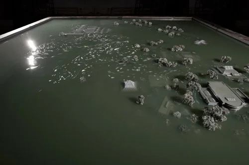 “A pool filled with lagoon water from which every 3 minutes a replica of the Giardini in Venice emerges for a few seconds and then sinks back down, as if a mysterious and lost civilization were rising back to life.”