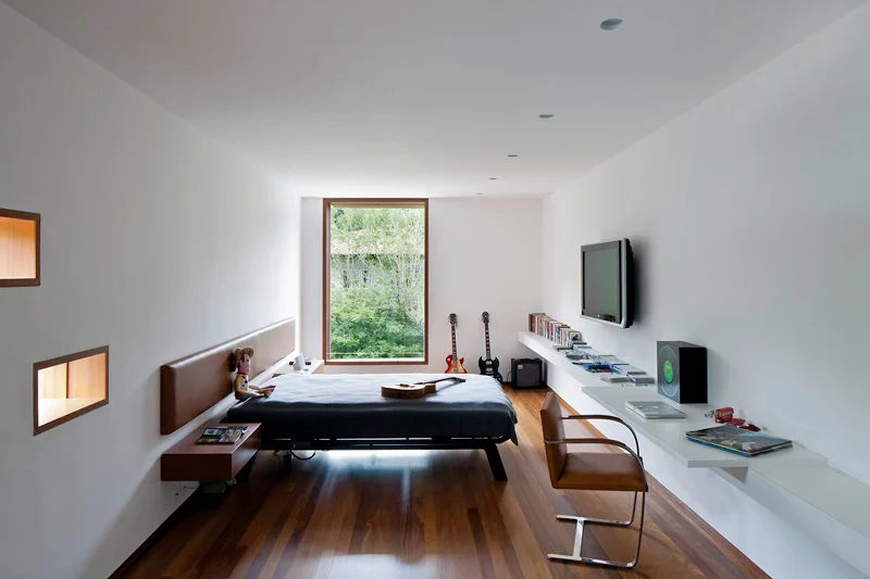 “This was an interesting commission. The client wanted an entirely sunken bed with hidden storage and invisible heating! We couldn’t go down as it was on the first floor so we raised it up. A simple solution elegantly executed, the floor lifts up to reveal storage ‘bins’ with a matching stepped drawer unit.” Materials Solid maple throughout.A minimalist bedroom? Bad. Ass.