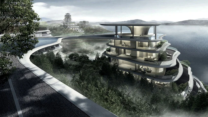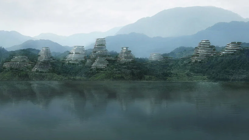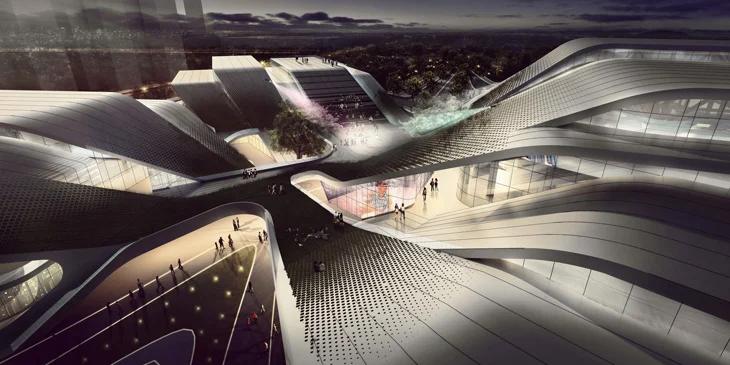 vincent callebaut architectures designs ‘the swallows nest’ as a faceted gem of culture anchoring the northeast entrance to taichung gateway park in taiwan. formerly an airfield, the space is being developed as an urban ecosystem in the shui nan ecological gateway district of taichung city. the building’s form is a triangle rotated 80 times around an elliptical möbius strip. as it spirals around an ellipse, the volume elevates from the ground plane, leaving vaulted apertures to the central void, which becomes the ‘endless patio’. vertices of the geometry sink below ground, creating a large lobby with reception, ticketing, shops, and cafes. a glass canopy hovers at ground level, opening the space to direct sunlight, and providing a feature in the courtyard above. a hall connects this subterranean space to the convention center, workshops, and archives. the lowest levels consist of underground parking and systems of protection from natural disasters.
