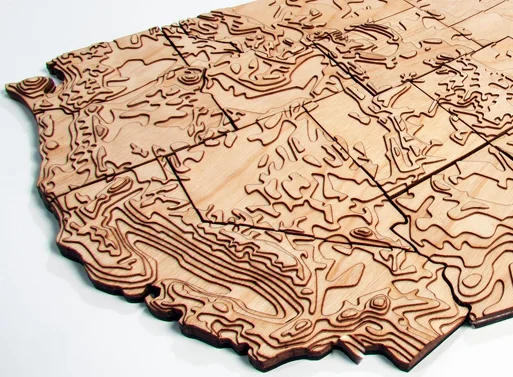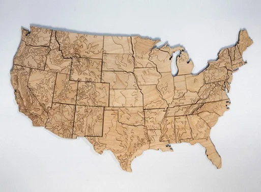 Created from actual elevation data, this wooden topographical map of the United States is laser-cut and hand-assembled in Portland, Oregon.