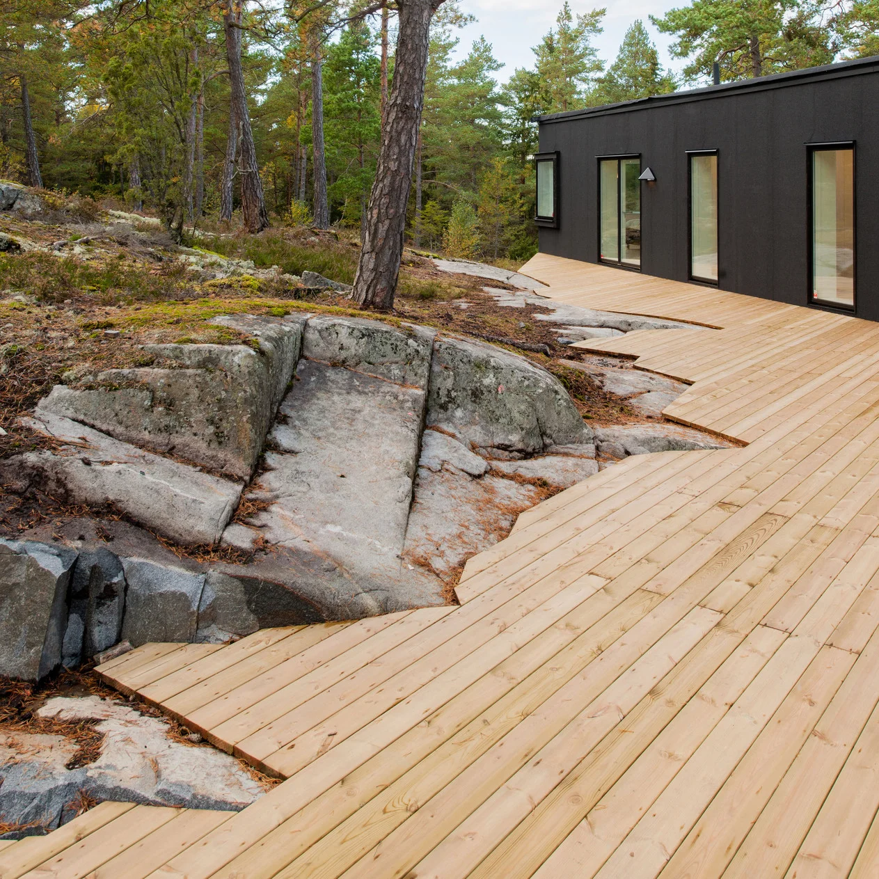 The surrounding nature and slope dictated the shape of this house fully covered in black roofing felt, and features the beautifully crafted timber deck.