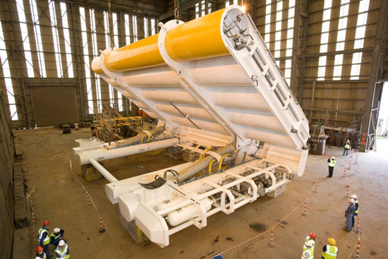 The key is the Oyster’s simplicity. It’s basically a giant hinged flap pushed by wave energy, with just seven pieces — two hydraulic pumps, four valves and a hinge — that send pressurized water ashore. Once there, this water drives a turbine, making the Oyster’s power-generating guts more like a typical hydroelectric power plant than any ocean-energy idea tested to date.