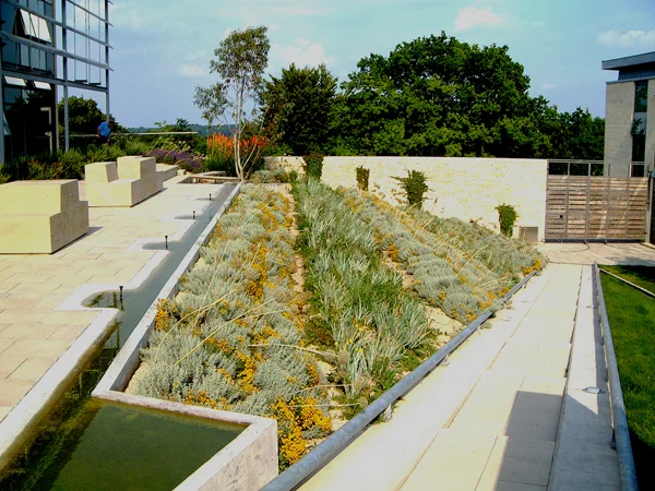 The scheme was one of the first in England to use porous paving for car park areas, and integrated swales and soakaways also contribute to water conservation. Semi-mature trees are used as a solar shading system for the building, providing climate moderation as well as visual pleasure. A further success of the scheme has been the restoration of semi-natural habitats, including extensive rooftop wildflower grasslands with orchids. Care was taken to use and conserve site-specific limestone soils and planting mixes, and to make use of stone excavated on site.