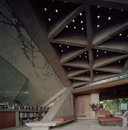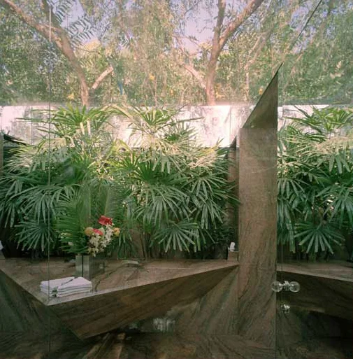 “This cool glass wall home in the Hollywood Hills by architect John Lautner blends beautifully into its surroundings. This stunning natural home design, encircled in lush landscape with a dazzling view in the distance, invites the outdoors in. Innovative ideas and modern finishes fuse with organic architecture elements like natural wood and glass, giving the house a serene, spa-like appeal in every room – and nowhere is this more apparent than in the bathroom, where the city skyline is visible from the unusual, contemporary tub. Just outside the glass wall, a jungle of more than 200 varieties of plants takes over the outdoors. Minimalist interiors really highlight these amazing views. John Lautner”