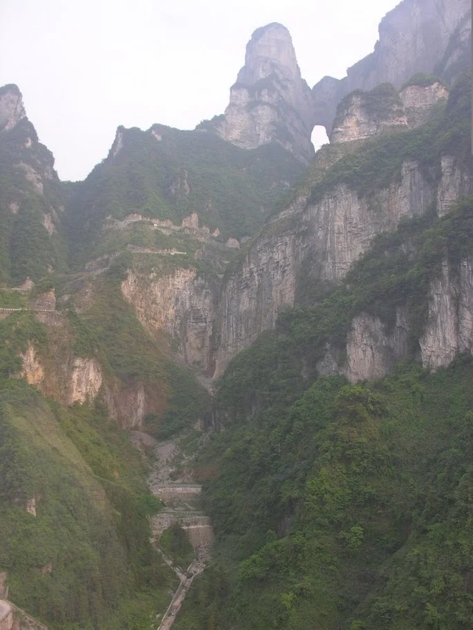 “Tianmen Cave is the natural water-eroded cave with the highest elevation in the world. In the year 263, the thousand-meter high cliff of Songliang Mountain suddenly broke open into a door-like cave which became a rare wonder of the world. Hence Songliang Mountain is change to Tianmen Mountain. Tianmen Cave runs south-northward with a height of 131.5 meters, a width of 57 meters and a depth of 60 meters. It’s much like a gate towards the heaven."