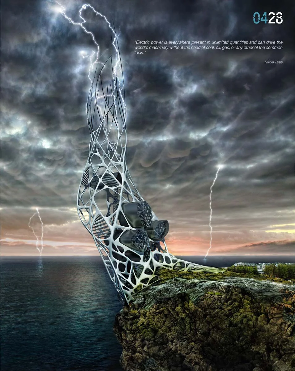 The Hydra-Tesla research facility is a skyscraper that investigates the possibility of creating a power plant that uses hydrogen as source of energy. With an exoskeleton built from grapheme, the idea for the Hydra skyscraper is to harvest energy from lightning storms via electrolysis and store the power in several mega-batteries located at the base. The project also includes a research facility, housing, and recreational areas for scientists and their families.