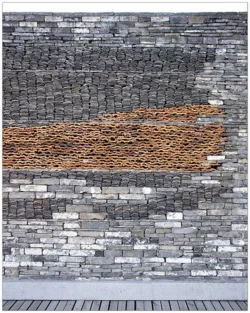 a wall by wang shu, who, I just learned, practices ‘slow building’, in china. he recycles the buildings that demolished in china’s feverish construction phase to build new buildings.